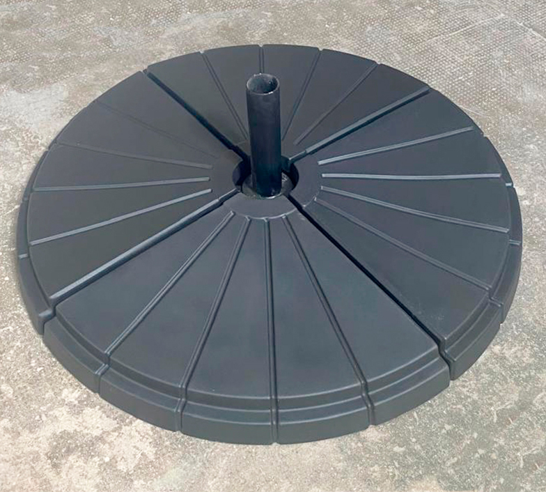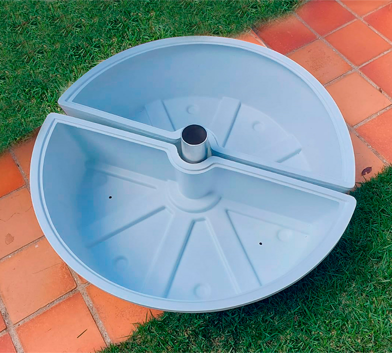 A base de floreira é divida em duas partes. Ela é feita em polipropileno (plástico) e deve ser preenchida com pedras, terra e flores, sendo o mínimo de 90kg a 120kg necessários para manter o guarda sol estável. É possível colocar somente pedras para dar o peso na base e assim a sustentação.